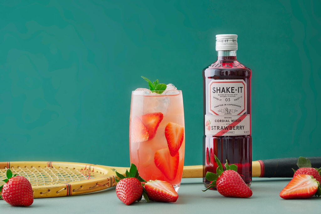 - Lägg en skivad jordgubbe, flädersaft, äppelmust, färsk limejuice och Shake-It Mixer® Strawberry i ett highballglas.