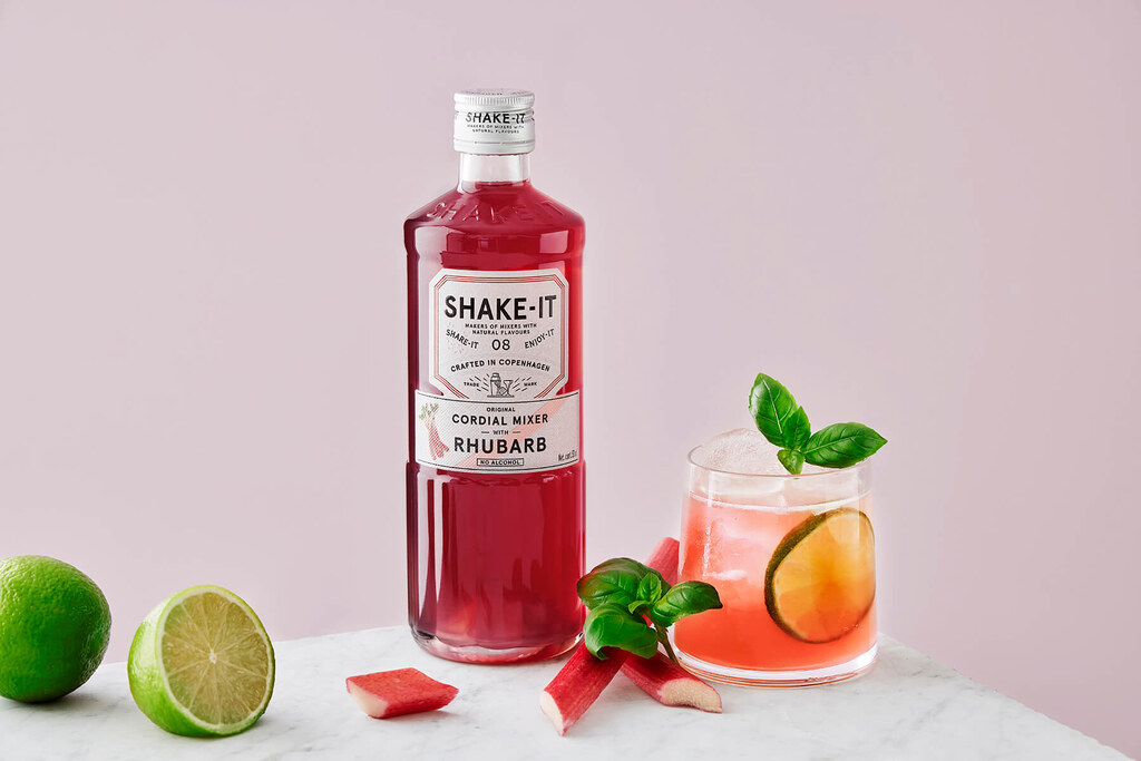 - Häll 4 cl Shake-It Mixer® Rhubarb, 2 cl citronjuice och 2 cl Shake-It Mixer® Sugar Cane i en shaker med 6 st basilikablad.