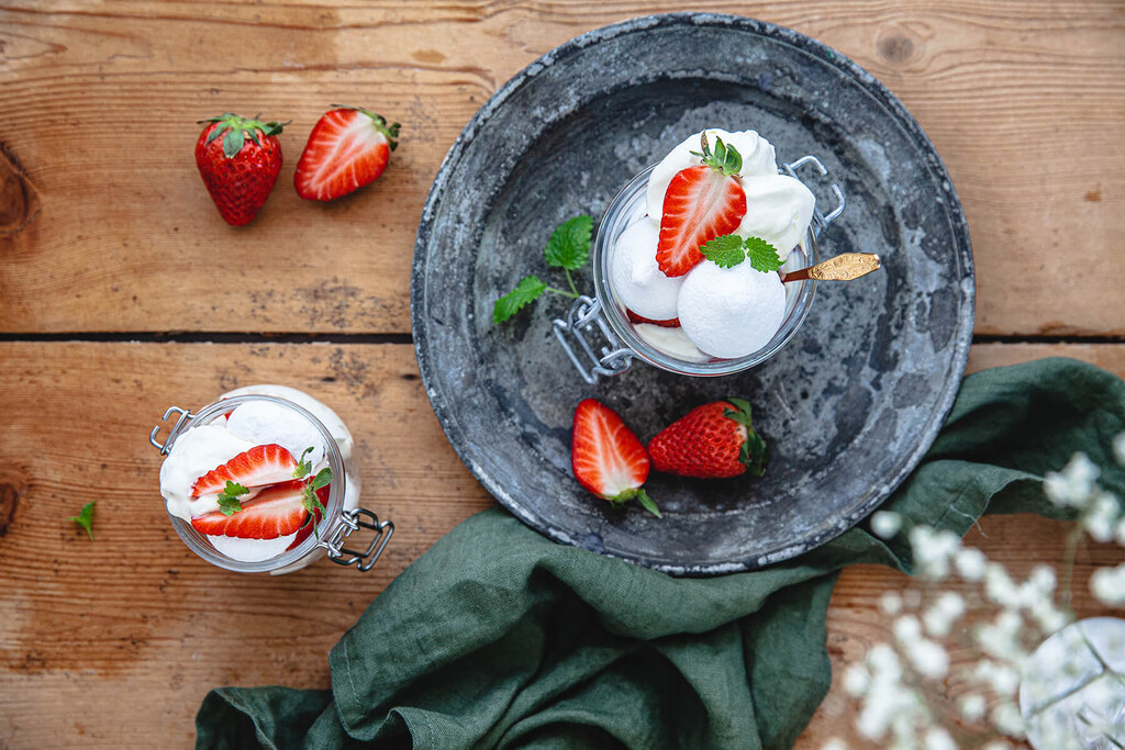 - Lägg en kula vaniljglass i botten på varje burk. Varva sedan skivade jordgubbar, sylt, grädde och maränger. Avsluta med jordgubbar och lite citronmeliss.