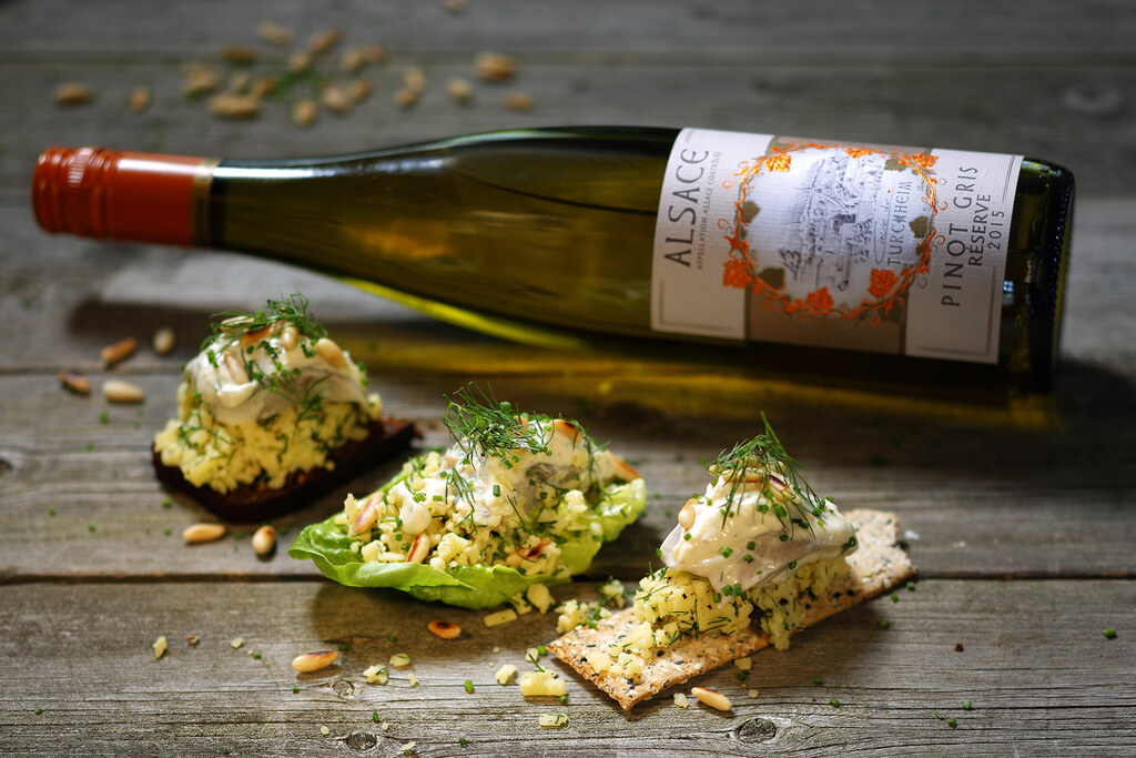 - Toppa med en bit sill och garnera med dillvippa, gräslök och rostade pinjenötter.