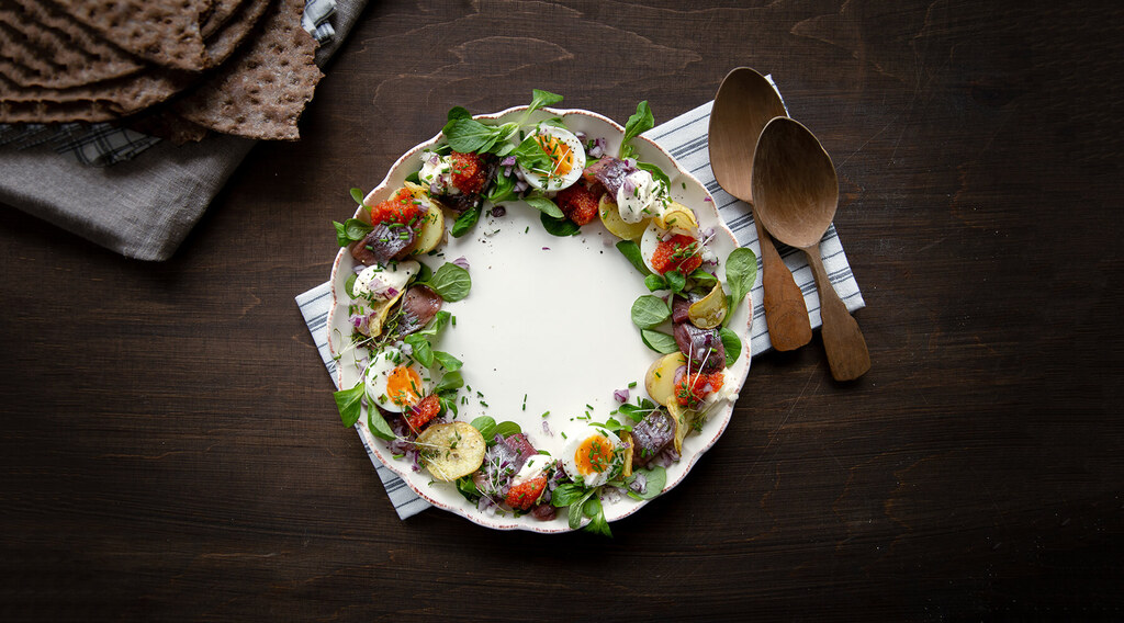 - Fortsätt att klä kransen med sallad, sill, smetana, caviar, chips och strö sedan försiktigt över rödlök, gräslök, krasse, salt & peppar