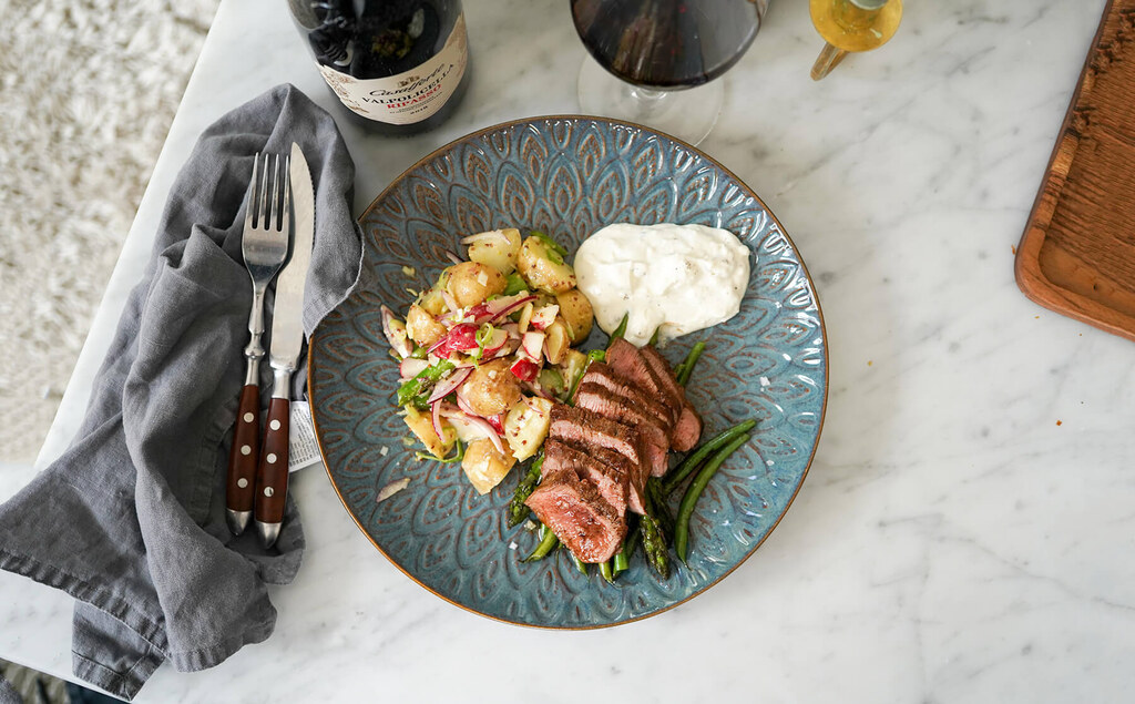 - Skär potatisen i mindre bitar och lägg i en skål. Tillsätt skivad rödlök, salladslök, purjolök och de nedre delen av den delade stekta sparrisen (som du kan skära ner ytterliga i lite mindre bitar). Blanda i senapskrämen och rör runt. Smaka av med salt och peppar och låt stå till servering i rumstemperatur.