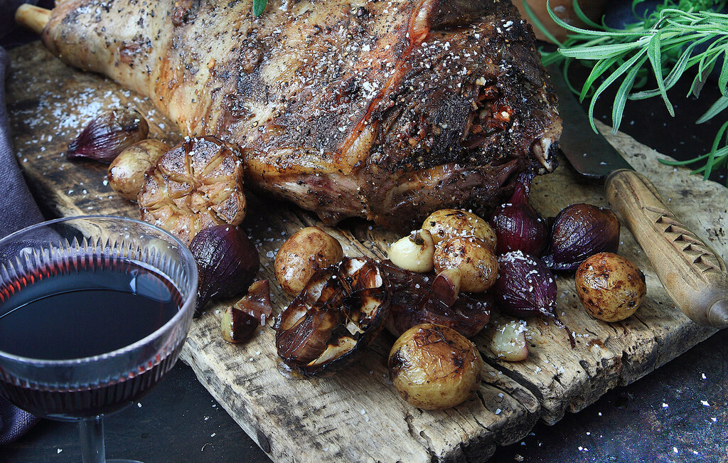- Ta ut formen och lägg hela potatisar, halverade vitlökar, skalade lökar, rosmarin, vin och balsamico runt köttet. Krydda med salt och peppar.