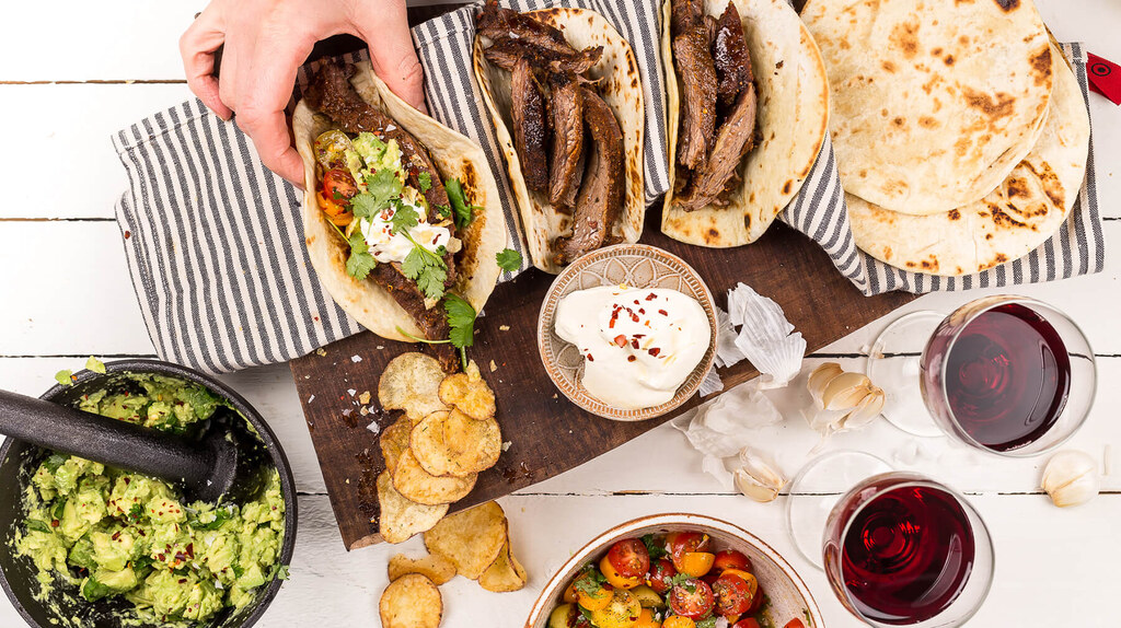 Moderna sköna tacos som passar de flesta tillfällen - varför inte en fredagskvälls afterwork? Bjud in grannar och vänner. Det otroligt möra och smakrika köttet är värt all väntan. Gnid in bringan med rub och någon droppe liquid smoke. Packa in i aluminiumfolie och baka 3-4 timmar i 110°C ugn. Skiva bringan, servera i tortilla med crème fraiche, tomatsalsa, guacamole. Grannarna kommer att jubla av lycka och ännu gladare när vinet som serveras gifter sig med maträttens alla härliga smaker. Lycka till!