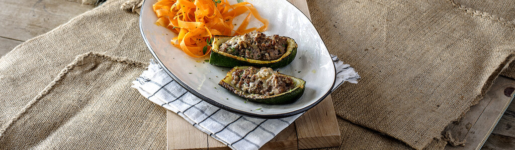 - Fördela potatisröran på botten av zucchinihalvorna och lägg på köttblandningen. Pressa inte ner köttet, låt det hellre ligga luftigt.